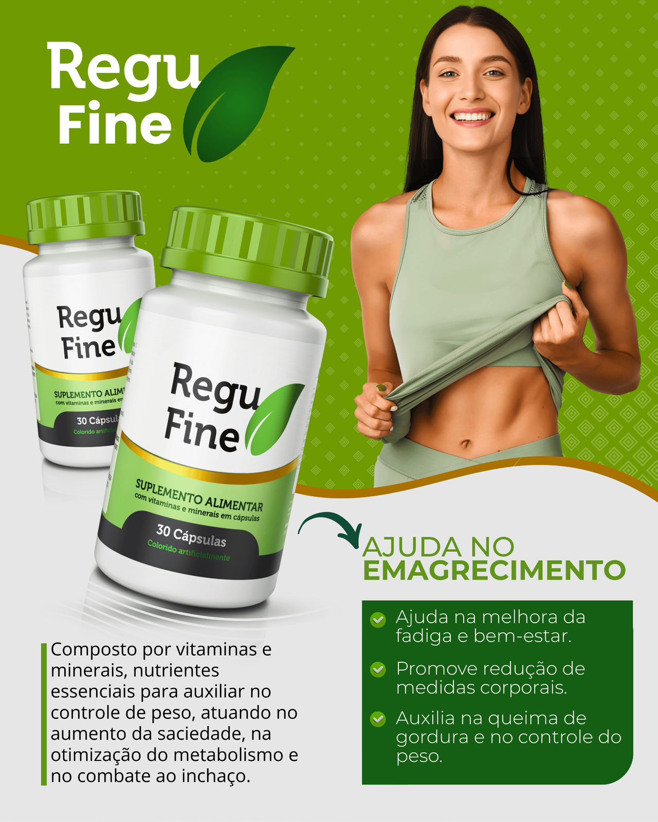 Regu Fine é o líder de vendas para emagrecimento, elaborado com o mais puro substrato da Groselha Negra, costuma surpreender novos clientes e satisfazer os cliente que já o conhece. Além da Groselha Negra, o Regu Fine também traz em sua composição vitaminas e colágeno, fundamental para uma pele bonita. Ele é um suplemento alimentar natural que visa auxiliar pessoas com algum grau de obesidade ou que querem perder peso.