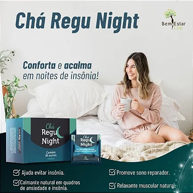 o CHÁ Regu Night com 6 componentes perfeitamente unidos a fim de proporcionar um sono reparador, menos estresse e melhor qualidade de vida.